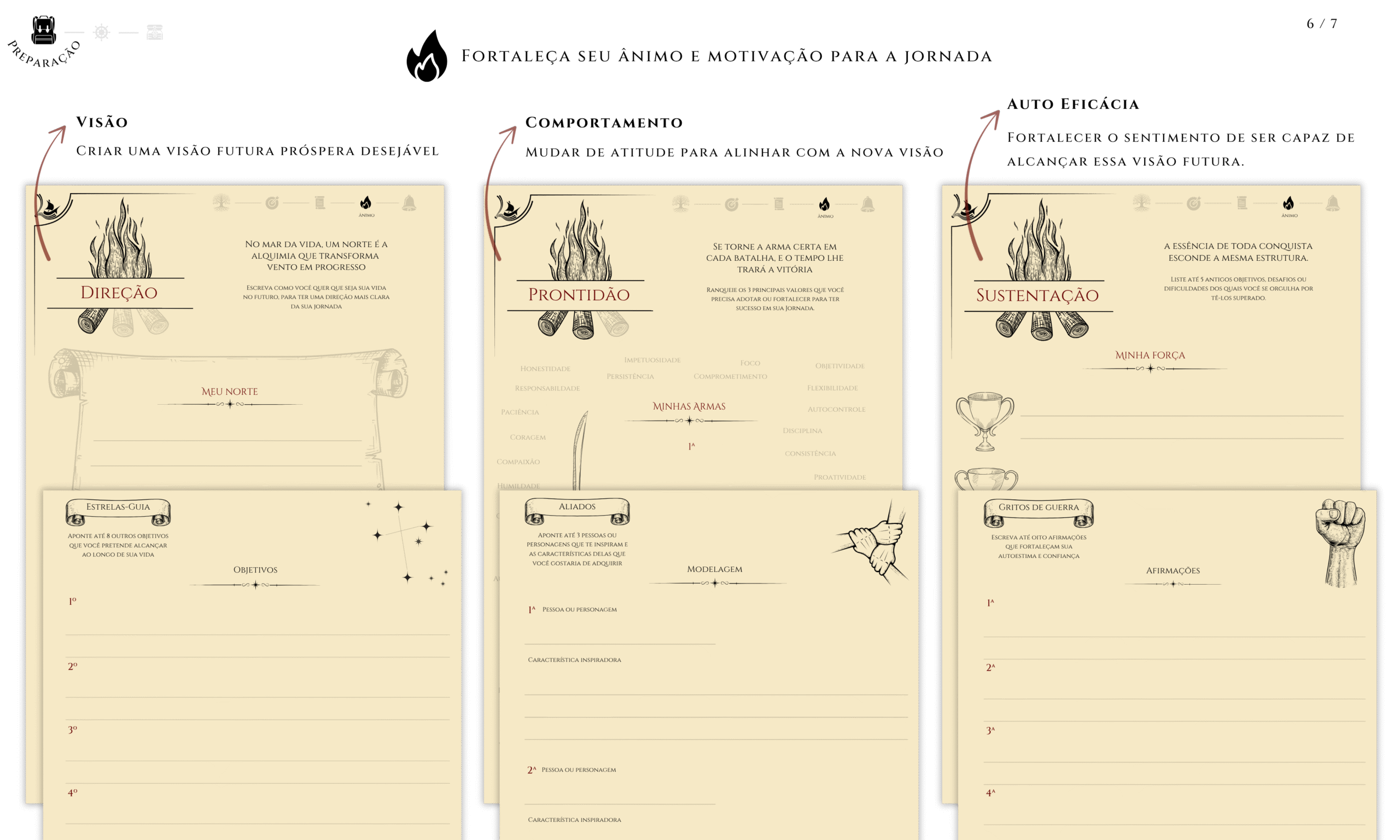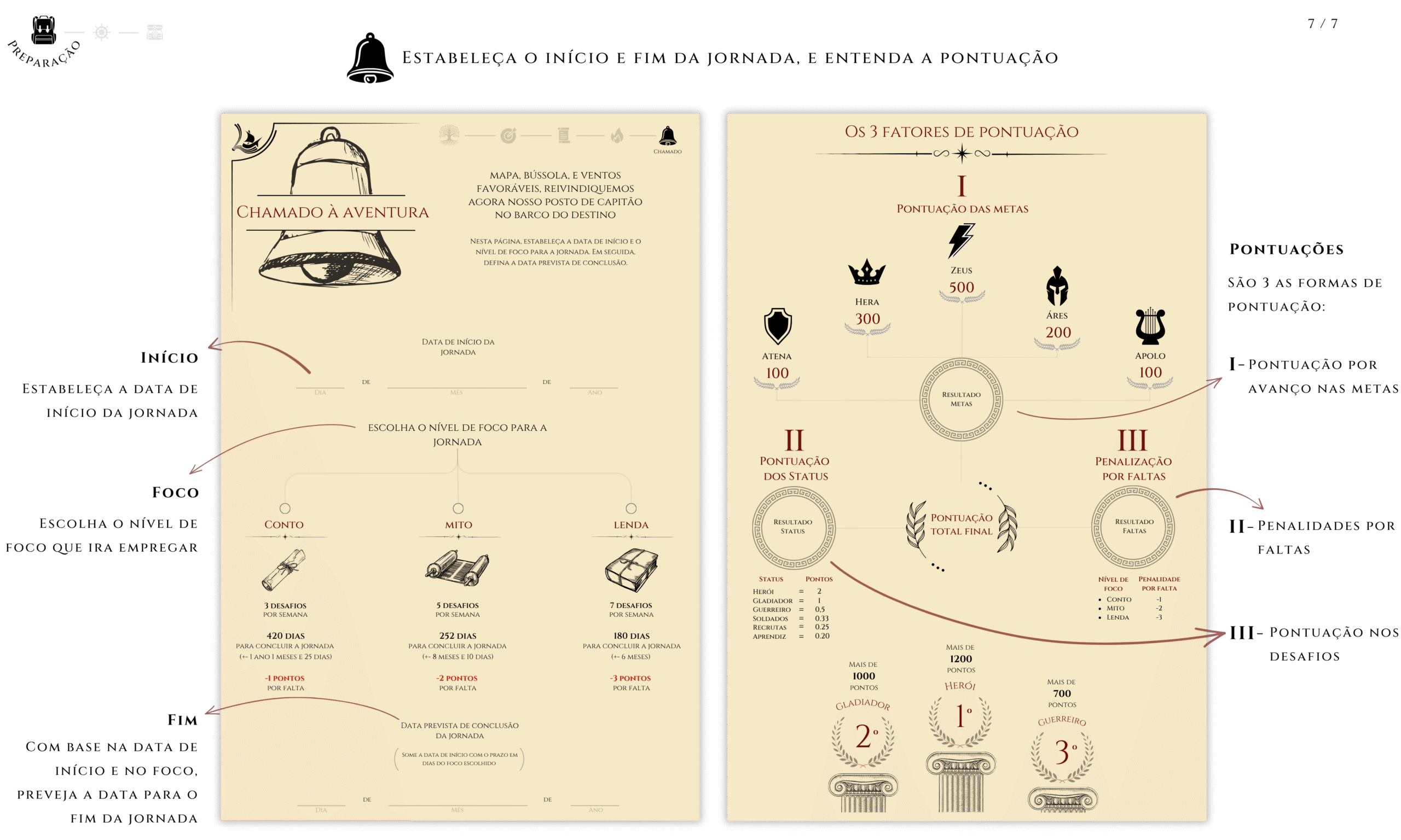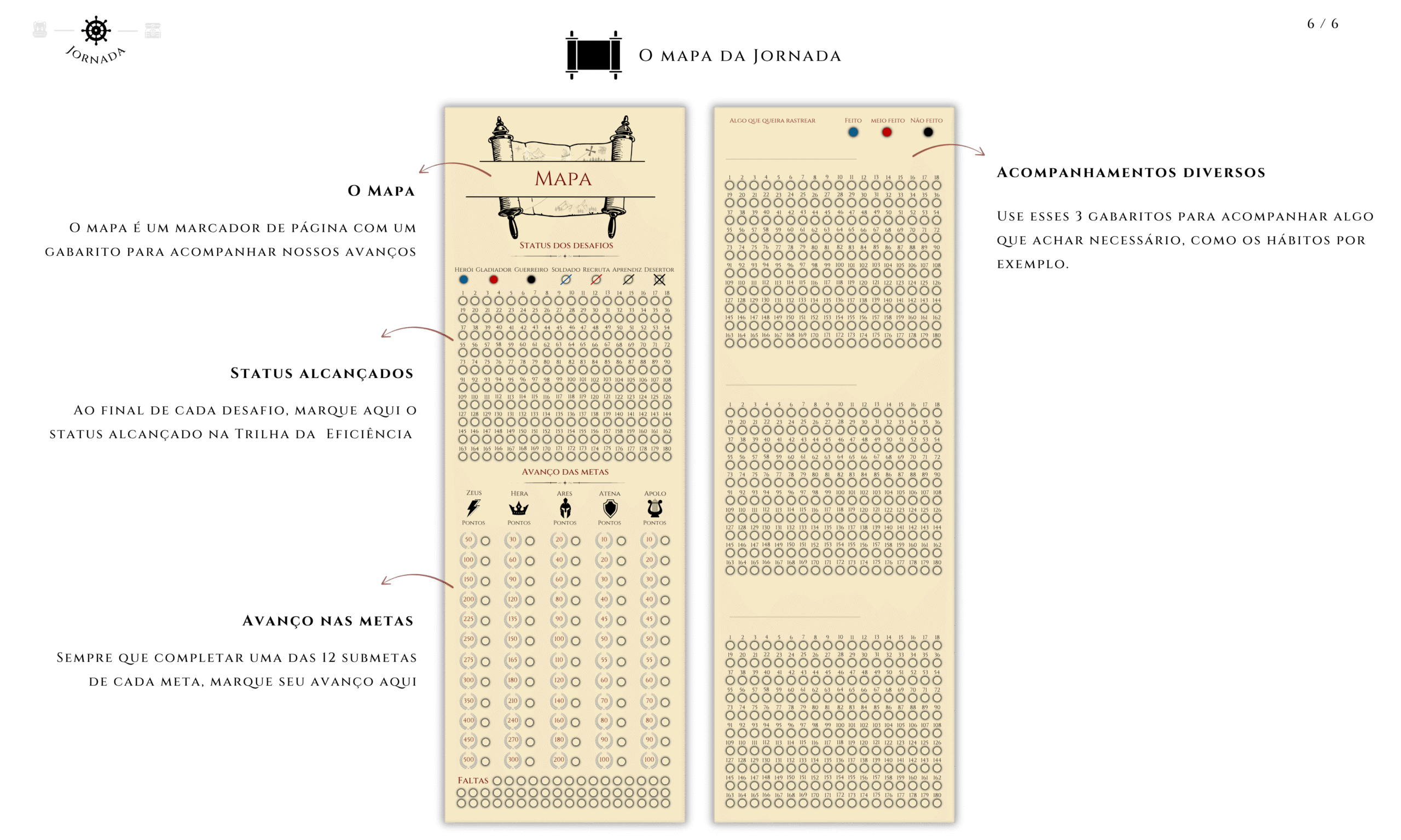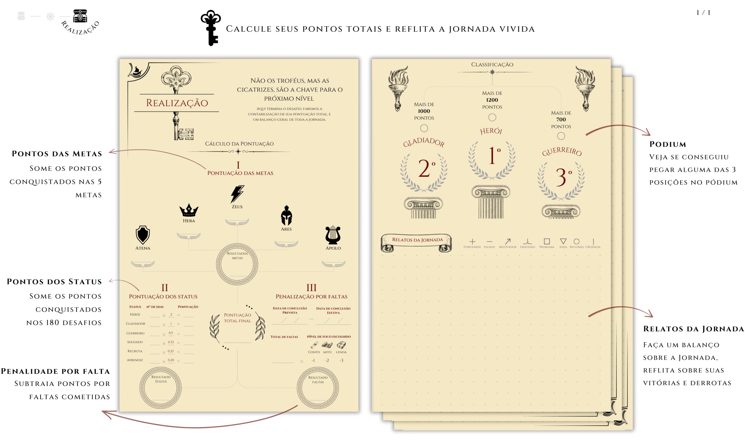 Seu progresso dentro do Journey Book será medido por um sistema de pontuação, onde cada avanço se torna pontos conquistados. Ao final, sua pontuação revelará seu nível produtivo alcançado, estimulando a auto superação.